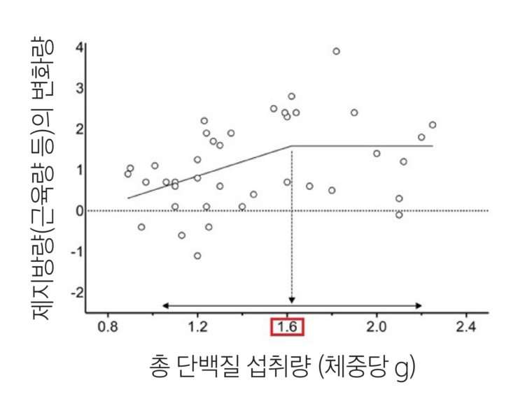 근력 운동을 열심히 하는 젊은 사람이라도, 총단백질 섭취량이 1.6g/kg/day를 초과하는 단백질은 근육량이나 근력 향상에 더 이상의 이점을 제공하지 못했다 (아래 그래프).