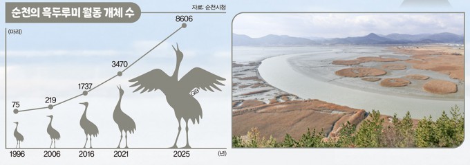 특히 이번 겨울에는 지금까지 중 가장 많은 8606마리의 흑두루미가 순천을 찾았습니다. 멸종위기종으로 전 세계에 약 1만 5000마리만 남은 흑두루미 가운데 절반 이상이 순천에 모인 셈입니다.