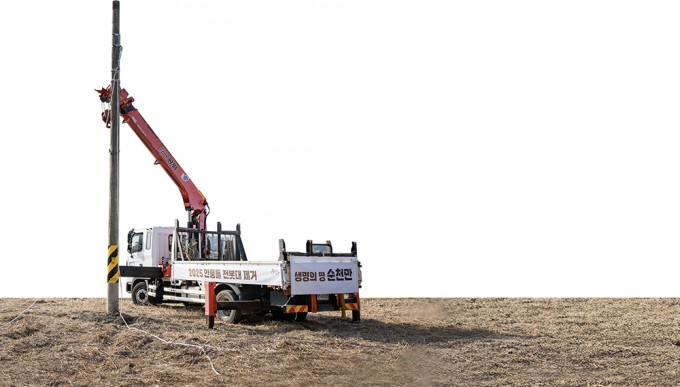 전봇대는 새가 날아오르거나 내려앉을 때 걸리기 쉬운 장애물입니다. 2008년쯤 순천에서는 흑두루미 등 철새들이 전깃줄에 걸려 다치거나 감전되는 사고가 잇따랐습니다. 이에 2009년 순천시는 전봇대 282개를 뽑아내 전깃줄과 함께 땅속에 묻었습니다. 이를 시작으로 순천시는 흑두루미를 위해 순천만의 환경을 차근차근 바꿔 왔습니다.